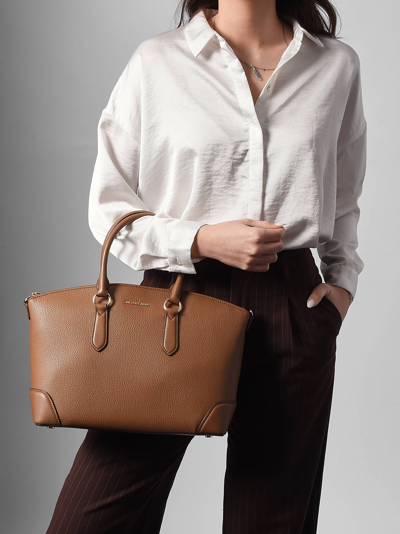The MURPHY handbag by MICHAEL KORS combines elegance and practicality. Crafted with attention to detail, it secures with a zip closure to keep your belongings safe. The 12 cm handle offers comfortable hand carry, while the adjustable and removable shoulder strap provides an additional option for crossbody wear according to your preference. Inside, the bag features a spacious single compartment with a zip pocket to neatly organize your essentials. This bag is perfect for chic and practical everyday use.