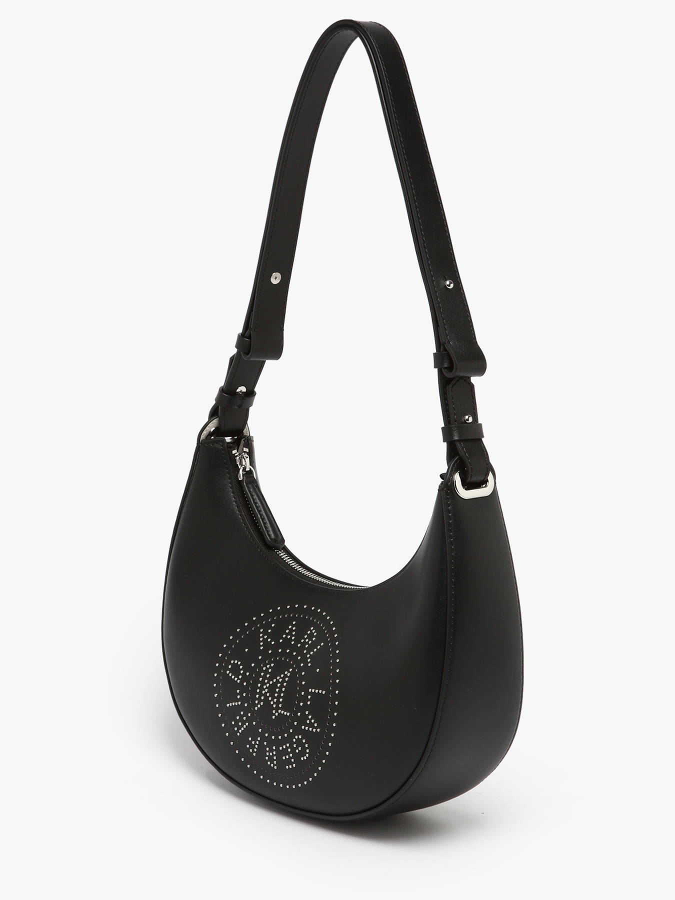 The K CIRCLE shoulder bag by Karl Lagerfeld combines elegance and modernity with its high-quality cowhide leather design. Featuring a secure zip closure, it ensures optimal protection for your belongings. The 34.5 cm strap height allows for comfortable shoulder wear, perfect for everyday use or stylish outings. Inside, it offers one spacious compartment and a simple pocket, making it easy to organize your essentials. This compact and refined bag embodies the bold and sophisticated spirit of the Karl Lagerfeld brand, ideal for those seeking a functional accessory while showcasing a confident style. Its timeless silhouette and meticulous finishes make it a must-have in the modern wardrobe.